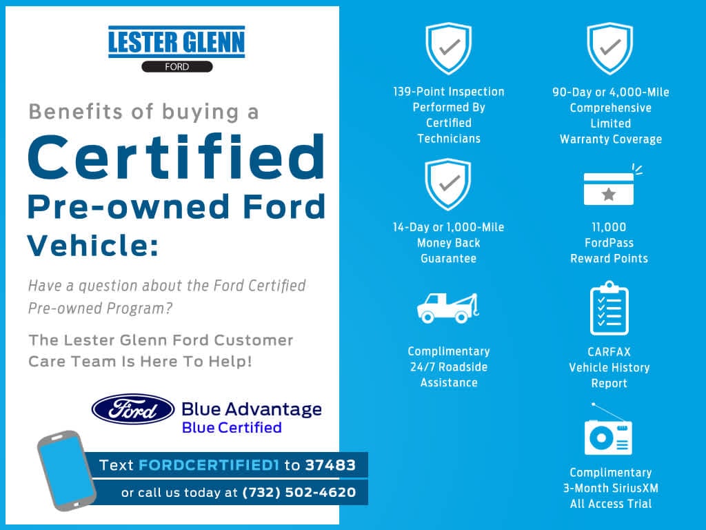 EXPERIENCE THE WAY CAR BUYING SHOULD BE. EXPERIENCE LESTER GLENN! Lester Glenn Ford offers complimentary loaner vehicles and shuttle service while your vehicle is in for service with every pre-owned vehicle purchase! Call now for more details: (732) 775-1500. *Some Connected Services - INCLUDING Remote Start - May Require Subscription*