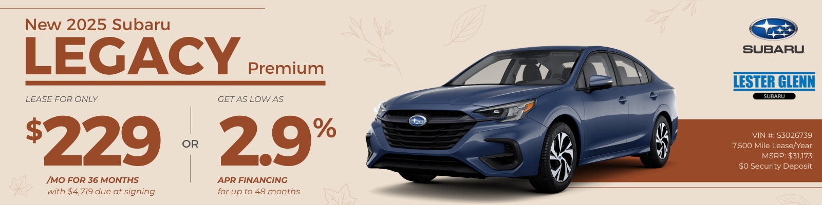 The Subaru Legacy is a sedan built to over-deliver on everything you want, while always making sure you have everything you need - safety and comfort! At Lester Glenn Subaru, we might be able to help you drive off our lot in a Subaru Legacy at an unbelievable price.