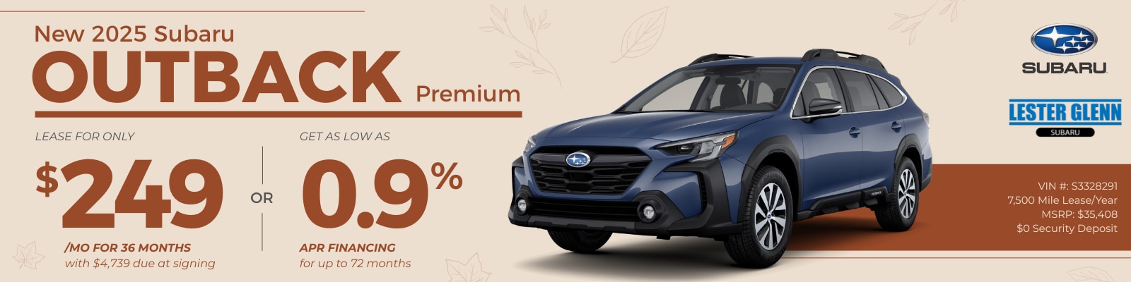 Now through December 1, 2025 get 0.9% APR Financing for 72 months on a new 2025 Outback. Monthly payment of $14.27 per $1,000 borrowed.