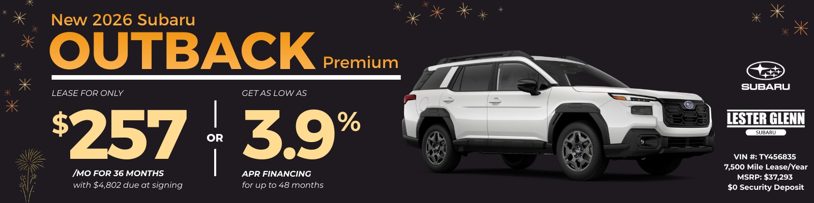 Now through February 2, 2026 get 3.9% APR Financing for 48 months on a new 2026 Outback. Monthly payment of $22.53 per $1,000 borrowed.