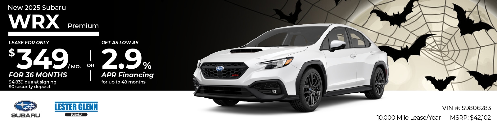 Now through October 31, 2025 get 2.9% APR Financing for 48 months on a new 2025 WRX. Monthly payment of $22.09 per $1,000 borrowed.