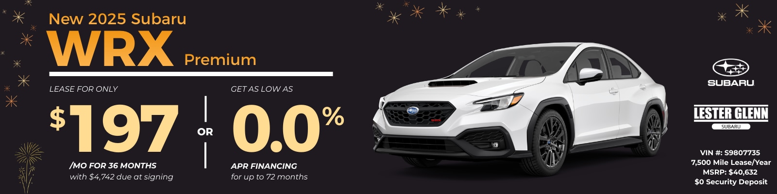 Now through January 31, 2025 get 0% APR Financing for 72 months on a new 2025 WRX. Monthly payment of $13.89 per $1,000 borrowed.